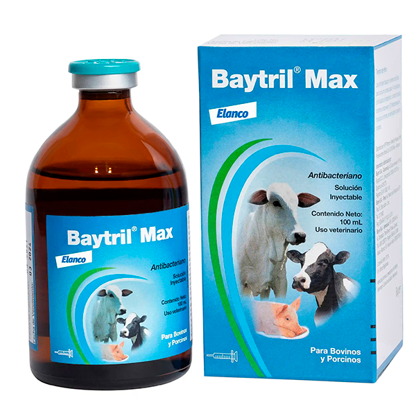 Antibiótico Baytril Max inyectable, indicado para bovinos y porcinos, en el tratamiento de enfermedades respiratorias. También puede aplicarse en vacas para mastitis aguda.