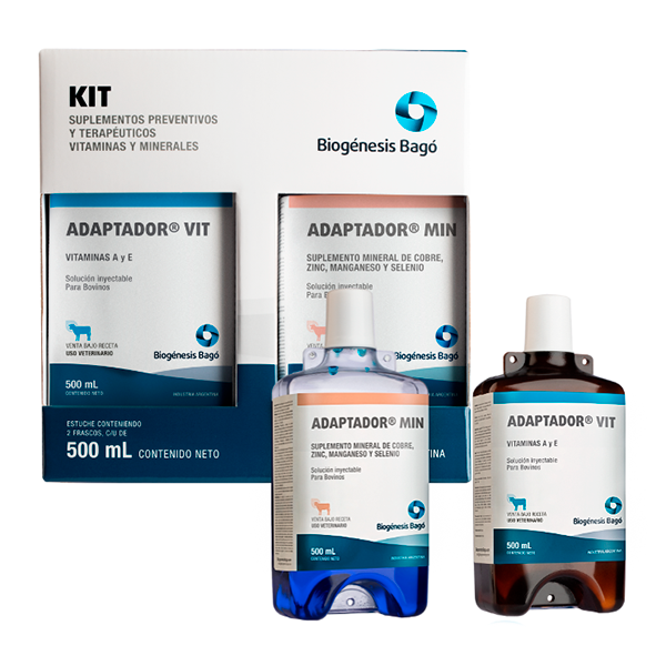 ADAPTADOR VIT es una solución inyectable de vitaminas A y E, indicada para ser utilizada sola o en forma conjunta con ADAPTADOR MIN, para que ambos intervengan impidiendo fundamentalmente los procesos oxidativos que se producen en los animales ante cualquier situación de estrés, como castraciones, destetes, ingreso a un feedlot, situaciones ambientales extremas (sequía o inundación). Las vitaminas, junto a los microelementos,macroelementos y la energía aportada por la dieta (forrajes y granos), son requerimientos diarios que necesita el animal; aunque estos varían en sus aportes desde miligramos a kilogramos, todos tienen el mismo valor y un desbalance en ellos provocará deficiencias que afectan al animal.