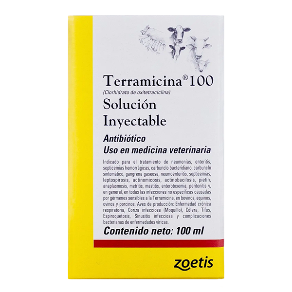 Solución antibiótica inyectable de Clorhidrato de Oxitetraciclina en Propilenglicol, perfectamente estéril y estable, lista para usar. Terramicina es la marca de fábrica para la Oxitetraciclina, un antibiótico de amplio espectro, eficaz contra bacterias, Mycoplasmas y protozoos de importancia en Medicina veterinaria.